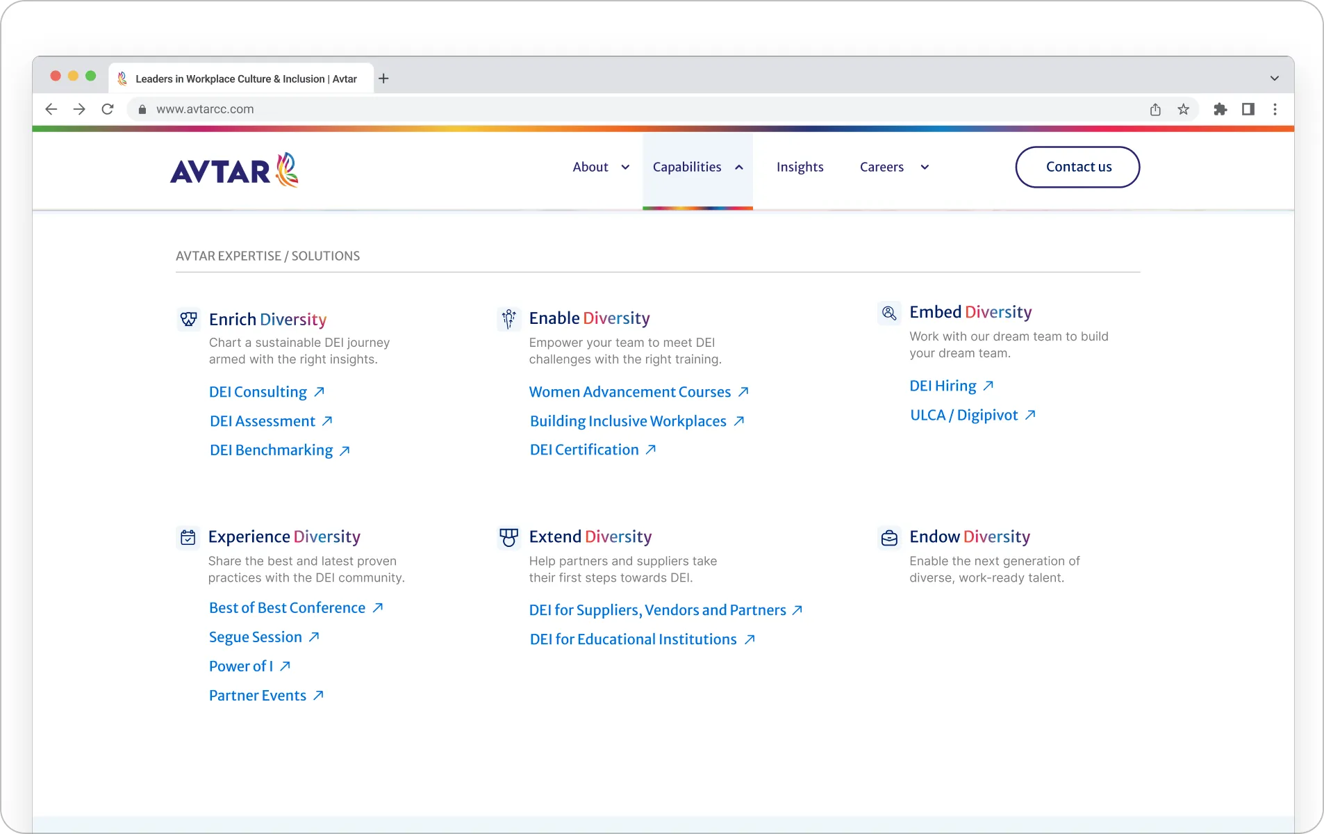 The central idea: build an impact canvas. Instead of treating each offering as a standalone service, we reorganized Avtar’s work into a journey-based architecture that aligned with how users actually progress in their DEI transformation.