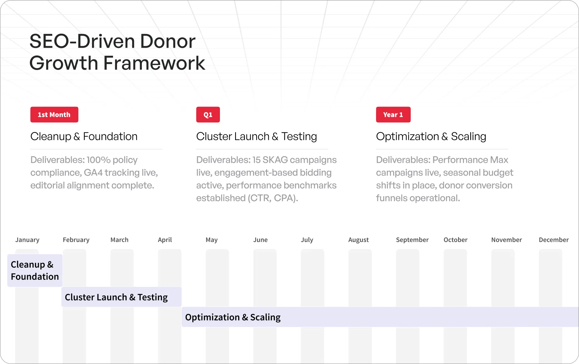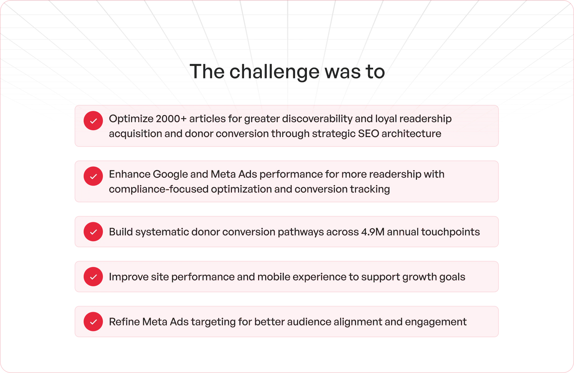 Strategic diagnostics across SEO, Google Grants, and Meta Ads, designing frameworks to convert readership into sustained donor engagement. We focused on building conversion infrastructure that transforms IDR's editorial authority into systematic donor acquisition while maintaining their journalistic integrity and mission focus.