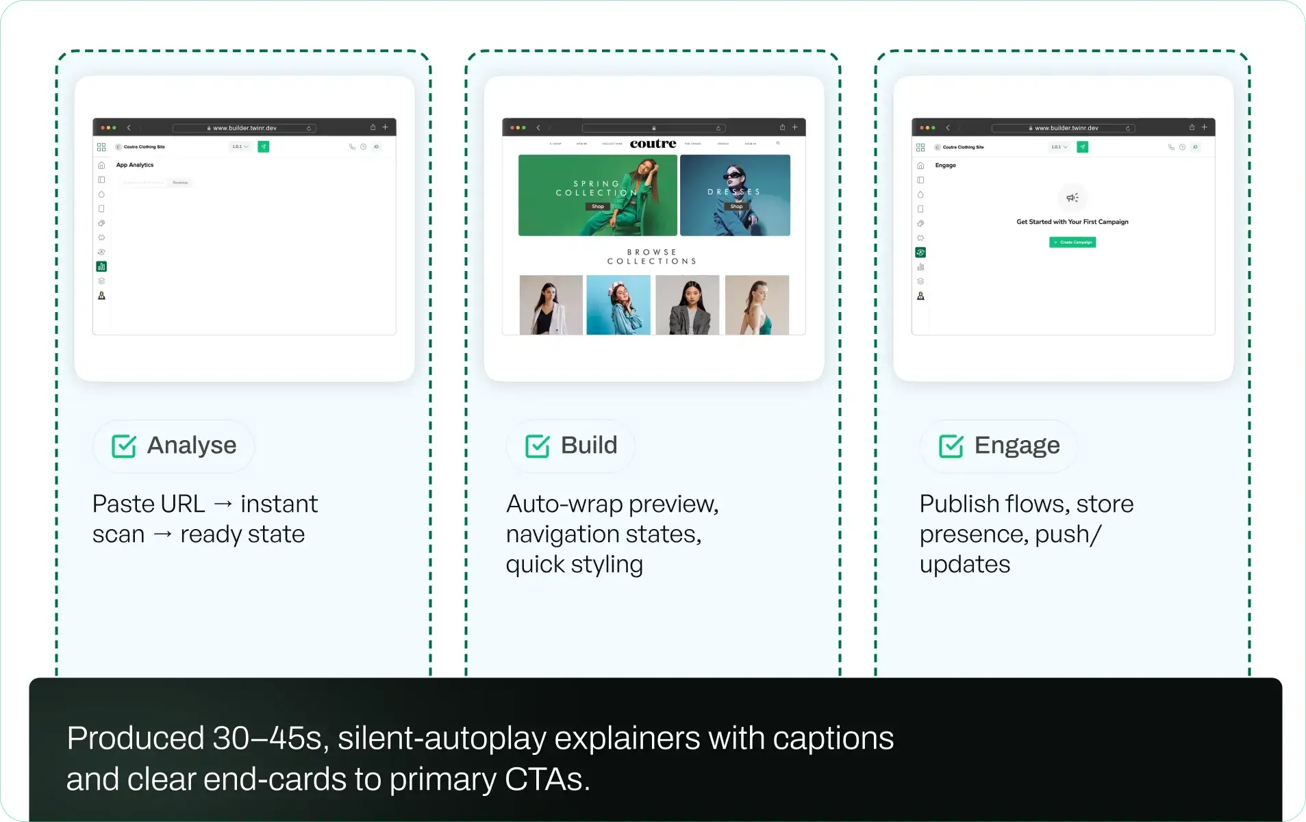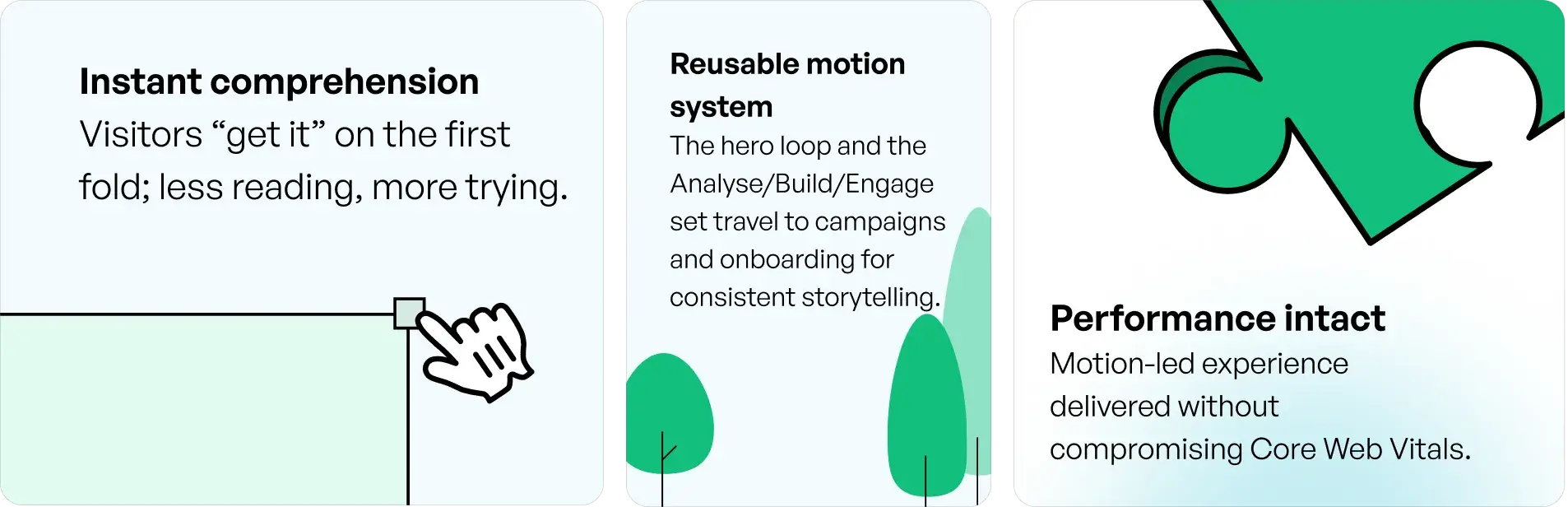 The hero loop and the Analyse/Build/Engage set travel to campaigns and onboarding for consistent storytelling.
